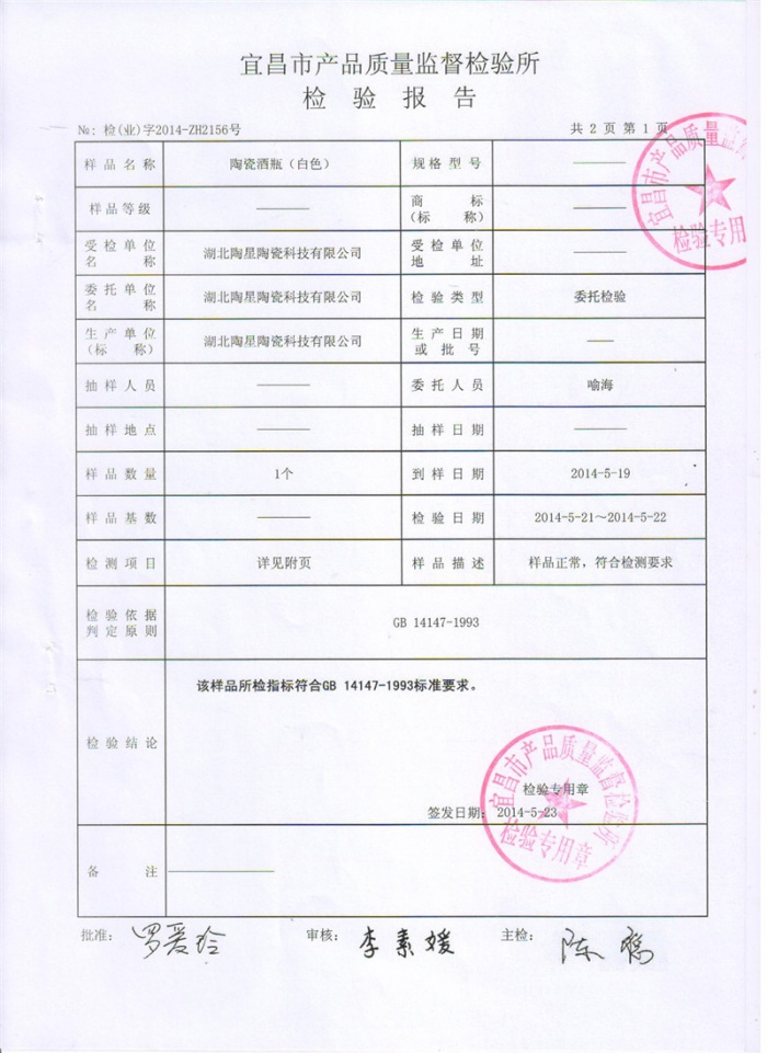 陶瓷酒瓶白色質(zhì)檢報(bào)告