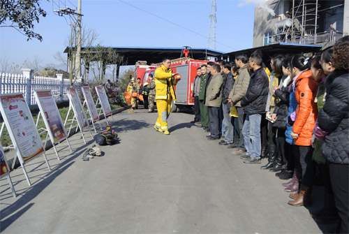 “喂,119嗎?我們這里起火了,你們趕緊來??!”一名從“起火處”逃出來的員工迅速撥打了救援電話,幾分鐘時間,遠(yuǎn)安縣消防大隊兩輛消防車緊急駛?cè)胩招翘沾晒久簹庹尽笆Щ饏^(qū)域”,消防人員首先向現(xiàn)場人員了解了起火位置、水源、消防設(shè)施等情況,現(xiàn)場指揮員根據(jù)情況立即組織人員安排部署救火工作。拉起警戒線、疏散人群,設(shè)置水槍陣地、對準(zhǔn)起火點(diǎn)、實施救火,消防人員經(jīng)過17分鐘的激烈作戰(zhàn),阻截了火勢蔓延,控制了險情,徹底將“大火”撲滅,圓滿完成此次演練任務(wù),贏得了在場所有人員的陣陣掌聲。