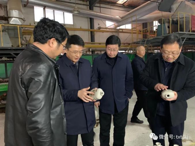 湯明(右一)查看陶星陶瓷生產(chǎn)制品
