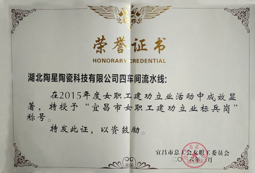 近日,湖北陶星陶瓷科技有限公司四車間流水線被宜昌市總工會授予“宜昌市女職工建功立業(yè)標兵崗”榮譽稱號,這是該班組繼2014年榮獲宜昌市“工人先鋒號”榮譽稱號以來再次攬得市級榮譽。