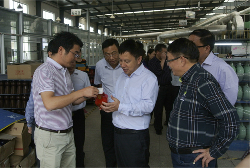在陶星陶瓷公司總經理杜修全、副總經理陳成的陪同下,張立新一行先后參觀了陶星陶瓷公司三車間修洗流水線、瓶蓋班,四車間自動注漿流水線、窯爐等生產現(xiàn)場。